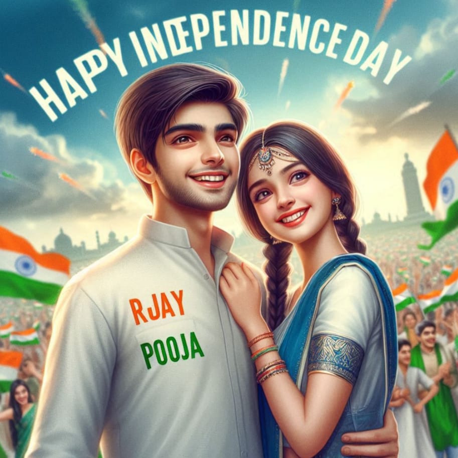 real young couple, Ajay and Pooja stand together, both 20 years old, joyfully celebrate Indian Independence Day. They are wearing indian outfits and RAJAN name is written on boy’s outfit and Pooja written on girl’s outfit. Above them, in the sky, the words “Happy Independence Day” are displayed in a bold font. The backdrop is filled with people celebrating, enhancing the festive and patriotic spirit of the day.make sure text should be correct.