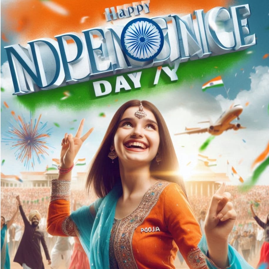 A real 20-year-old girl joyfully celebrates Indian Independence Day. she is wearing traditional Indian outfits with the name “POOJA” written on her attire. Above her, in the sky, the words “Happy Independence Day” are displayed in a bold font. The backdrop is filled with people celebrating, enhancing the festive and patriotic spirit of the day.