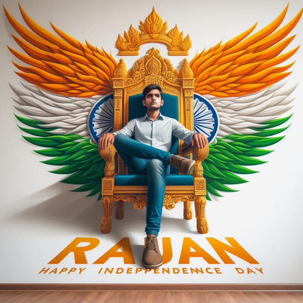 Create realistic illusion image A 20 years old boy is sitting on a king chair with indian tricolor wings and behind him the color of the wall is white on which “RAJAN” is written in golden. and also written Happy Independence Day” in clear letter written on small size on bottom.