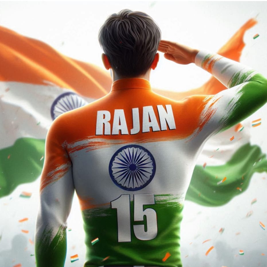 A 21 years old boy salutes the national flag of Bharat and he is wearing a shirt print is like Bharat flag and ” RAJAN ” and 15 number and republic day in small written on it’s back in big and bold fonts, 3d illustration.