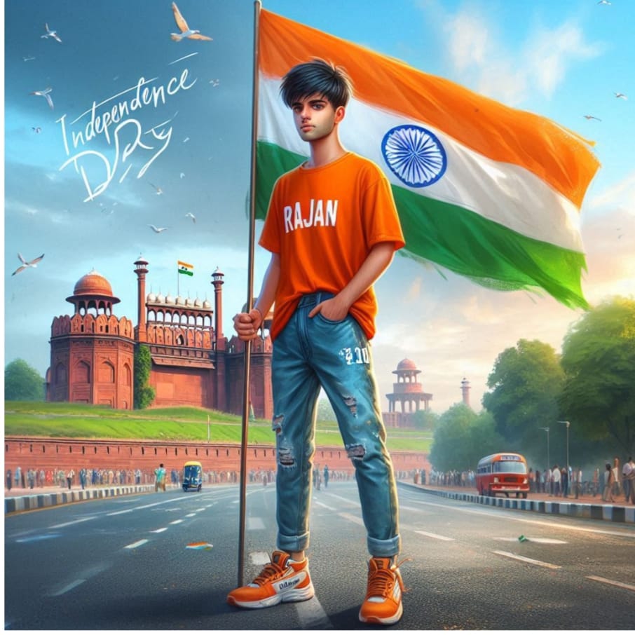 A real 20 years old boy, Wearing Orange T shirt blue jeans sneakers and the name “RAJAN” is written on his t-shirt and the boy is standing on the road with holding a national flag of India, and behind him is the Red Fort Delhi. And written on sky “Independence Day” Create Realistic image high quality.